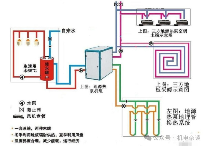 ①系统的能源主要为热能,因此配电容量小,运行耗电量小。