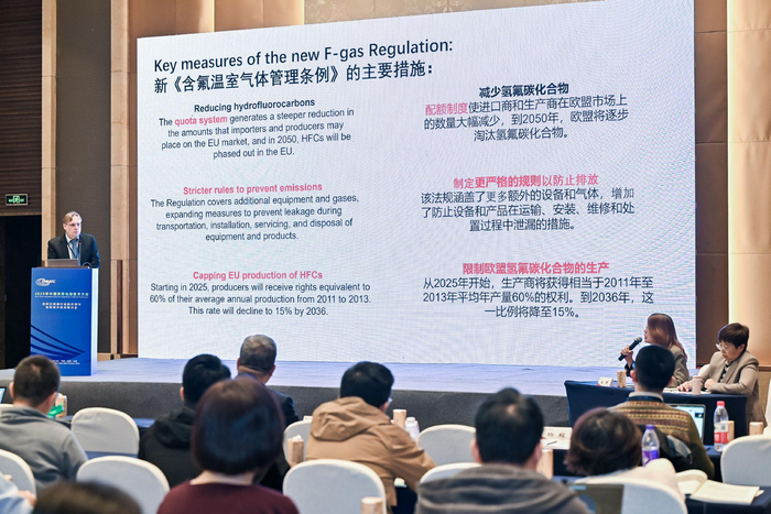 国际视野下的技术与政策借鉴为行业发展提供了重要参考。德国Öko-Recherche专家Ole Nielsen分享了“天然制冷剂在全球房间空调器行业的应用”,他指出,使用低GWP值制冷剂已成为全球空调行业替代的主流方向,而中国在R290等天然工质应用上的实践具有全球示范意义。德国国际合作机构的Markus Wypior则带来“欧洲HFCs管控政策及能效提升”的分享,介绍了欧盟F-Gas新法规对HFCs削减的严格要求,其中提到,涉及空调相关企业需遵守多项义务,进口含HFCs的空调设备需在F-Gas平台注册并持有进口许可证,确保HFCs纳入配额体系,投放市场前需完成合规声明并提交海关,每年3月31日前需上报上一年度相关进口情况,且需经F-Gas平台注册的独立审计机构核查,这无疑为中国空调出口企业敲响了警钟,也凸显了提前布局低GWP制冷剂的紧迫性。