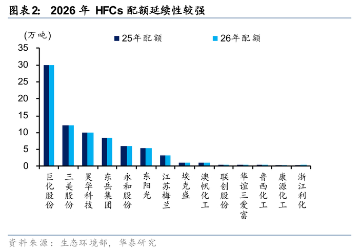 26年HFCs企业配额延续性较强,部分企业少量调整配额
